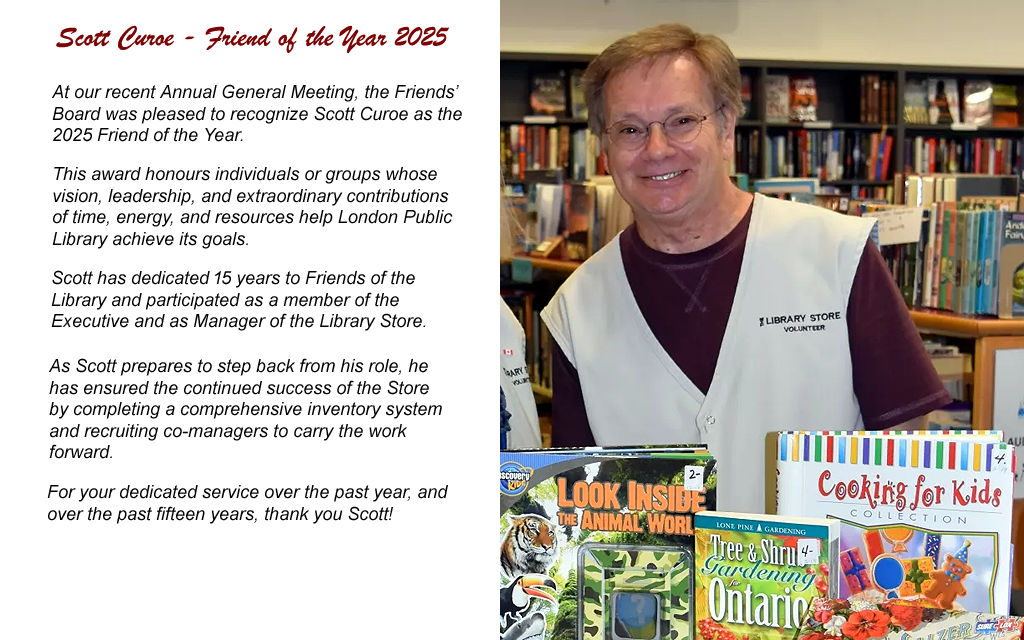 We presented the Friend of the Year award for 2025 to Scott Curoe, former Manager of the Friends of the Library Book Store for 4 years, and Co-Manager for 15 years. More Info