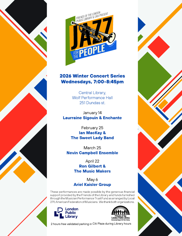 Jazz for the People is a very popular program co-sponsored by the Friends of the London Public Library and the London Musicians Association. This free jazz concert series at the Wolf Performance Hall features local musicians and visiting guest musicians playing a wide range of jazz genres. Look for Jazz for the People concert dates and coming performers.